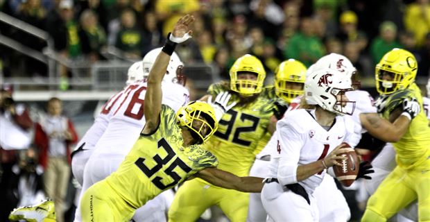 2017 — Accumulated six tackles in the season opener against Southern Utah including one sack ... Followed that up with five tackles against Nebraska and 1.5 tackles for loss ... Recorded first career forced fumble against NU ... Set career high with 1.5 sacks against Cal finishing the game with six tackles and a forced fumble ... Earned four tackles, including one tackle-for-loss, and a forced fumble at Wyoming ... Logged six tackles, including a season high two tackles for loss, at Arizona State 2016 — Started at defensive end in all twelve games of the season . . . Recorded 51 (27-24) tackles with 9.5 tackles for loss for 33 yards . . . Stood out vs Utah with a career-high of nine (7-2) tackles, 2.5 tackles for loss and a sack. 2015 — Injuries relegated him to the sidelines for the entire year after he contributed to the Ducks' success as a true freshman . . . Was shifted from outside linebacker to defensive end prior to the 2016 spring as part of the program's realignment to a 4-3 defensive and if the Spring Game was any indication, the change would appear to be to his liking . . . Led all tacklers with eight stops in the final exhibition of the off-season. 2014 — The true freshman appeared in 14 games primarily on the kickoff coverage team and as a reserve outside linebacker, posting 10 tackles (three of which came on special teams) . . . Recovered a fumble in the final quarter of a victory over Oregon State Click to view Justin Hollins's complete biography |